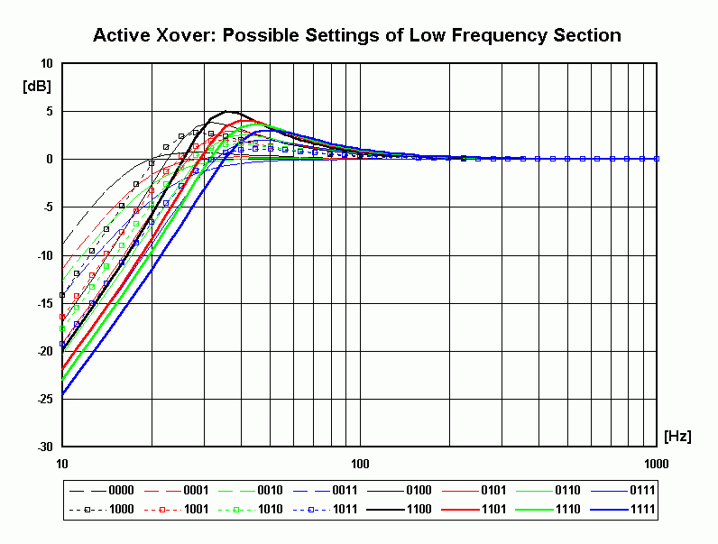 Im Tieftonzweig besteht die Schaltung aus einem Hochpass 2. Ordnung (12 dB/Oktave), dessen Eckfrequenz und Güte per DIP-Schalter kanalweise getrennt 16 verschiedene Kombinationen (und damit eine Anpassung an die Raumakustik) zulässt. Nach oben hin wird der Tieftonzweig mit einem Tiefpass 3. Ordnung (18 dB/Oktave) begrenzt.