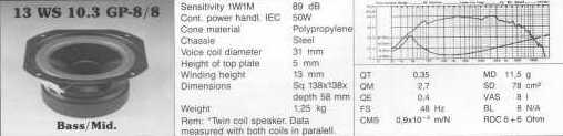 | 4 | SINUS | 13WS10.3GP8/8 | - 3500 | 138Q / 100 / 31 | Polypropylen | 2x6.0 | 48 | 2.70 | 0.40 | 0.35 | 8.0 | 89.0 | neu | 70 | 25 | Doppelschwingspule (als Bassboost) |