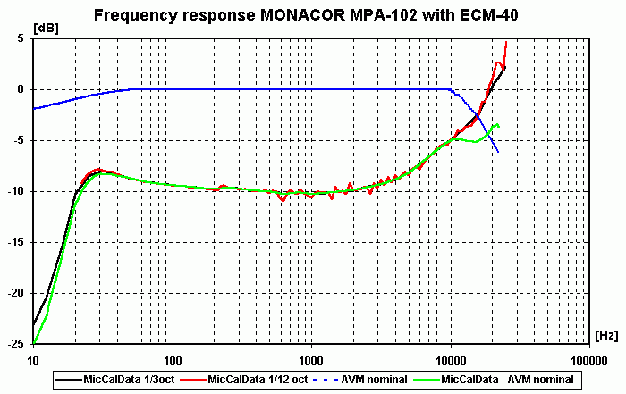 For those who don't like soldering there is a recommendation, too. The microphone pre-amplifier MPA-102 and the microphone ECM-40 (both from MONACOR, both together as an offer for 145 € at Audio-Z). However, the microphone shows a distinct increase at the upper frequency range: