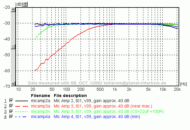 Finally I've compared the electrical behaviour of the "old" (MicPre2) versus the "new" (MicPre3) pre-amplifier (without capsule). Additionally the ELV-kit No. 17064 (rauscharmer Mikrofon-Vorverstärker) was tested (MicPre4). Although the later is by far the best choice electrically this kit doesn't fit into the softline box!