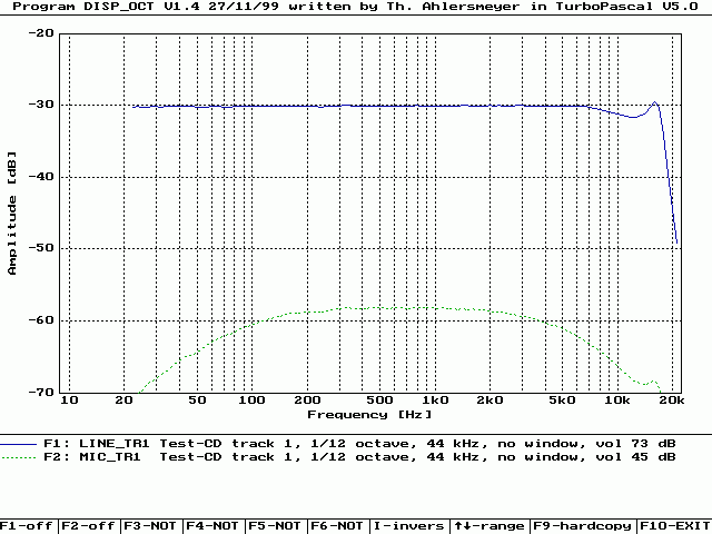 I've compared the so build microphone ("old" version, see above) with a professional BRÜEL & KJAER microphone Type 4188 (price about 1250 €). I've adjusted the internal amplification to give a sensitivity of about 1000 mV/Pa (which would correspond to 0 dB in the graphic below)! This allows to use the full dynamic range of the line input of sound cards with pink noise excitation of realistic levels in 1m distance (or at the listening location).